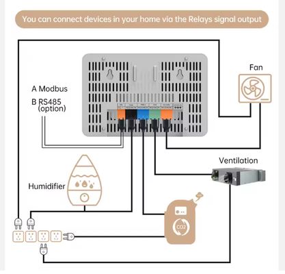 | Enkele uitgangsbedrading | RS485/Relais voor CO2TVOC, PM2.5 en vochtigheidssignaaluitgang |