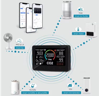Blijf de uitdagingen van de luchtkwaliteit binnenshuis voor met de WiFi Luchtkwaliteitsmeter, ontworpen voor real-time omgevingsmonitoring en slimme besturingsintegratie. Dit geavanceerde apparaat volgt continu CO₂, PM2.5, PM1.0, TVOC's, temperatuur en vochtigheid, en levert zeer nauwkeurige gegevens via WiFi en maakt naadloze communicatie met uw slimme systemen mogelijk.