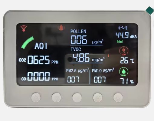 Real-Time IAQ Monitoring: Detecteert CO₂, PM2.5/PM1.0, TVOC's, temperatuur en vochtigheid met hoge precisie