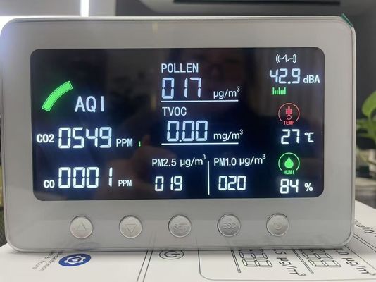 | Beoogd gebruik | Detecteer en digitaal real-time monitor: CO2, CO, Pollen, PM1.0, PM2.5, TVOC, Vochtigheid, AQI, Geluid |