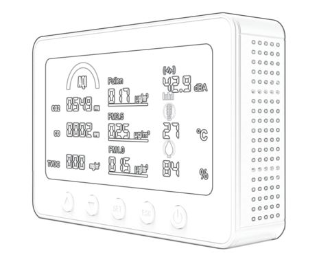 | Beoogd gebruik | Detecteer en digitaal real-time monitor: CO2, CO, Pollen, PM1.0, PM2.5, TVOC, Vochtigheid, AQI, Geluid |